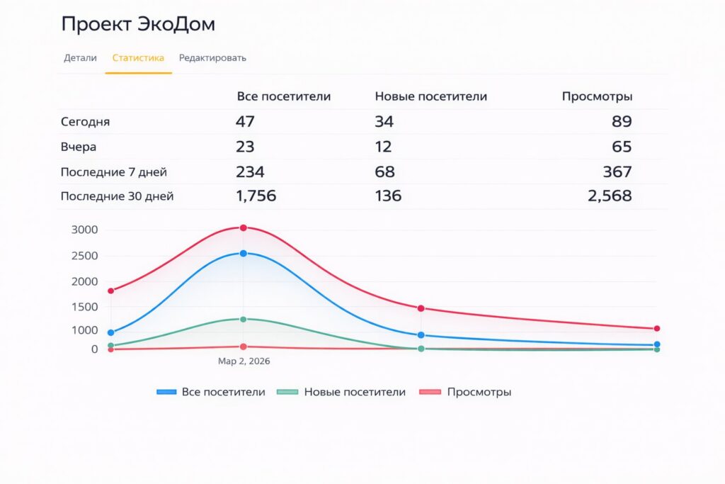 Отслеживайте просмотры и посетителей за последние 30 дней и оценивайте интерес к вашим проектам